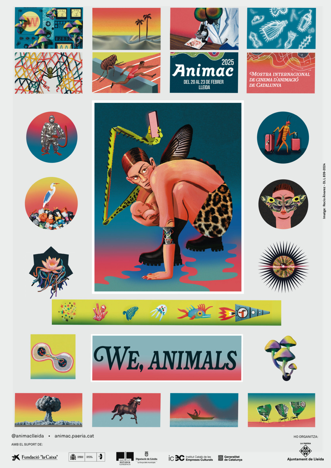 ANIMAC 2025’s official poster, created by illustrator and animator Rocío Álvarez, visually embodies the festival’s theme. Álvarez described the poster as a “set of miniature fables” presenting imaginative scenarios where humans and animals coexist.