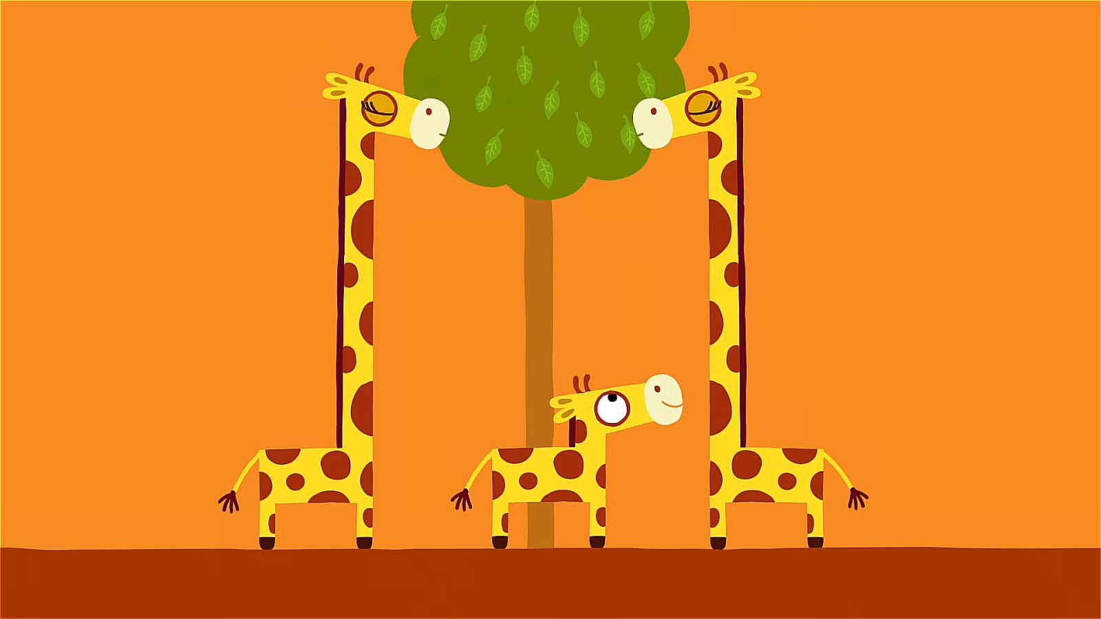The little giraffe wants to have some leaves from the trees. But it can’t reach them and the big ones won’t share any of it.