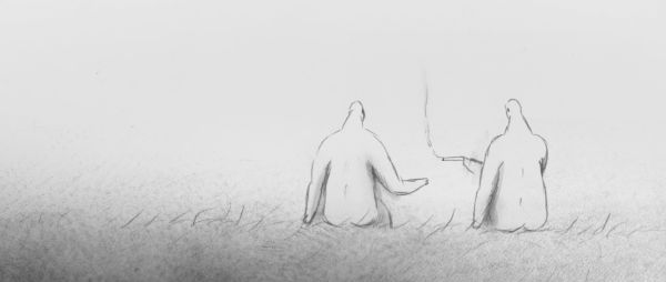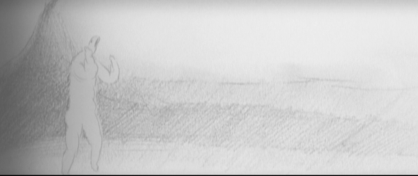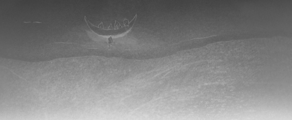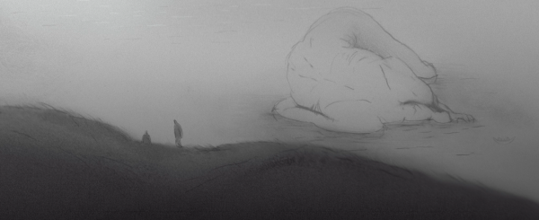 Tiny people wander across an endless waterscape and move mountains.