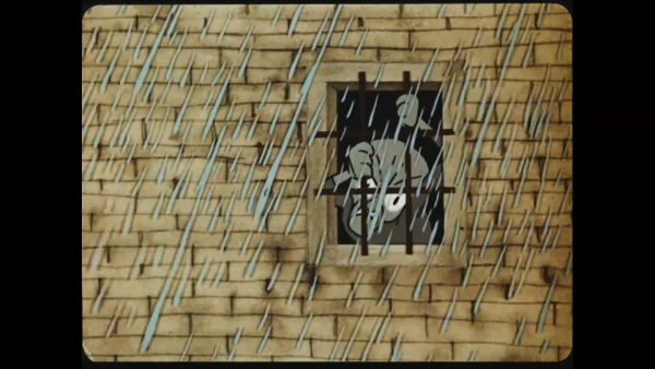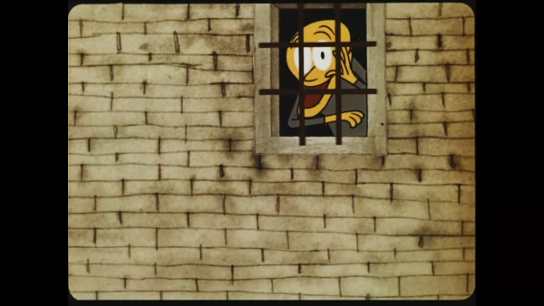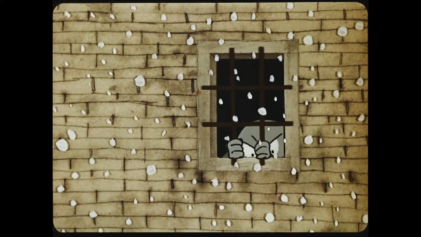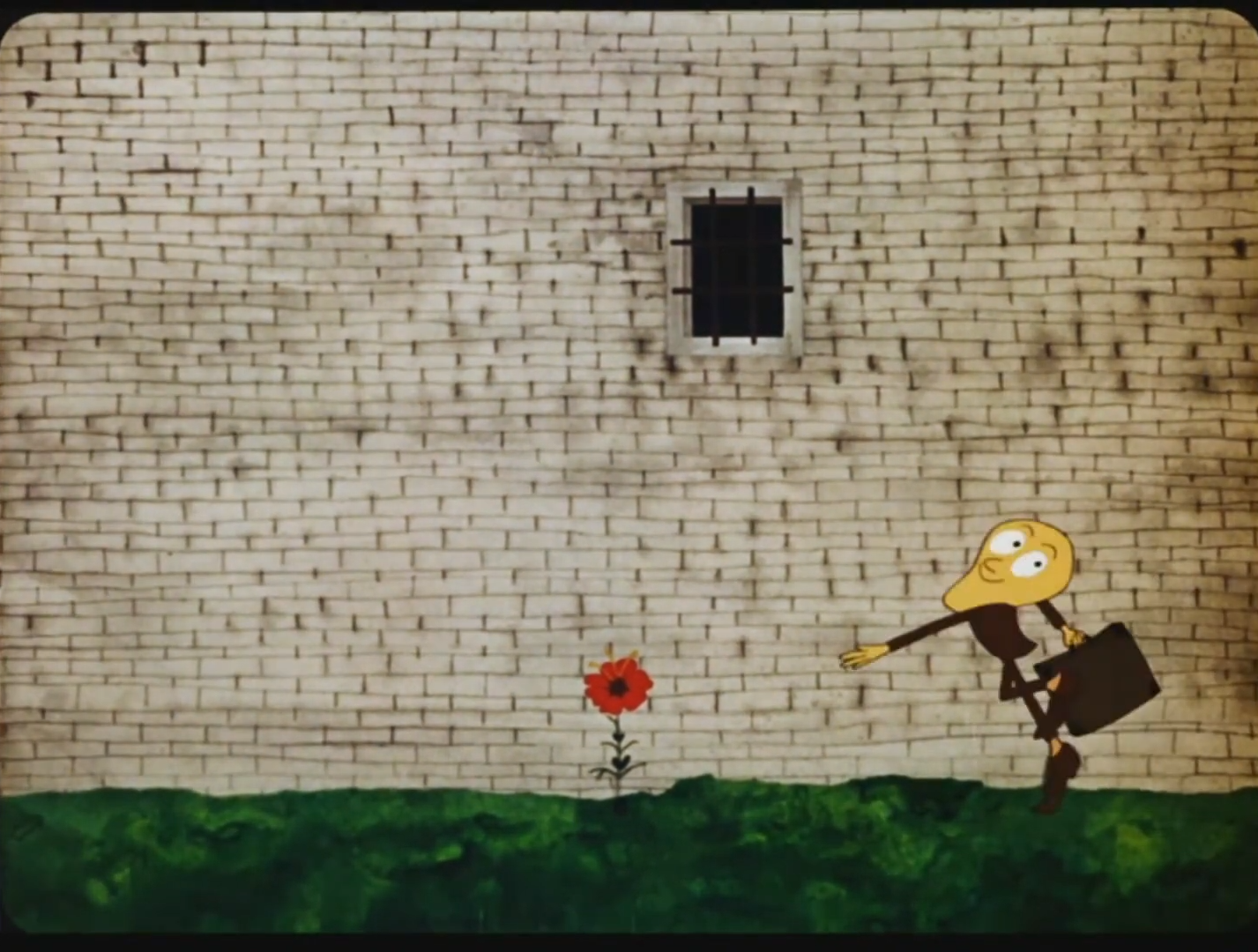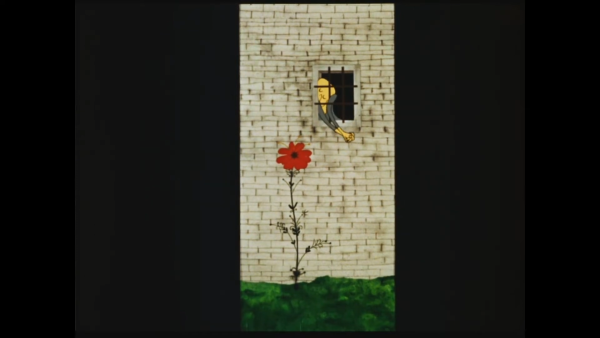 The Great Wall. At a small window, behind the bars, a man looks resigned. A red flower grows at the foot of the wall, out of his reach. And so the years pass… One spring, the prisoner is released, but now he pays no more attention to the flower and moves on with his life. A crushed flower remains behind him.