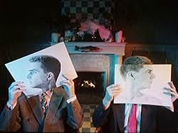 Two men in chairs by the open hearth; photos move in front of their heads.