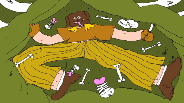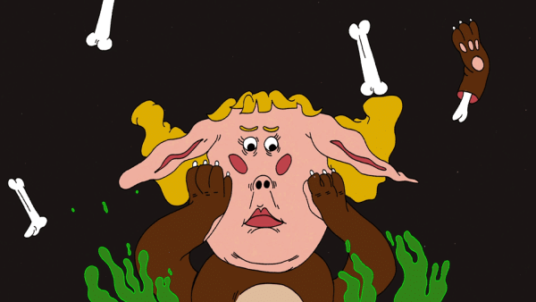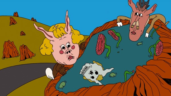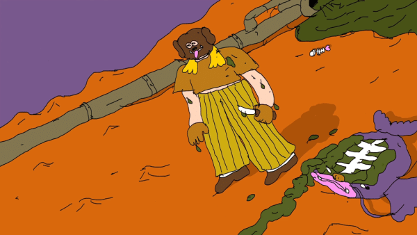 In a peaceful world where dogs have human heads, the protagonist has a furious argument with her partner and leaves the house in anger. She reaches a cenote and encounters a strange deer. She dives into the water, but a sea monster suddenly swallows her. The protagonist dies and undergoes a transformation, reemerging in a dark, apocalyptic world where humans have dog faces.